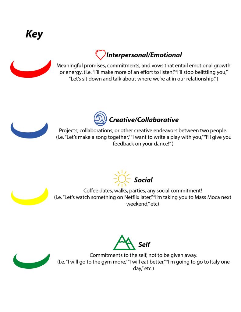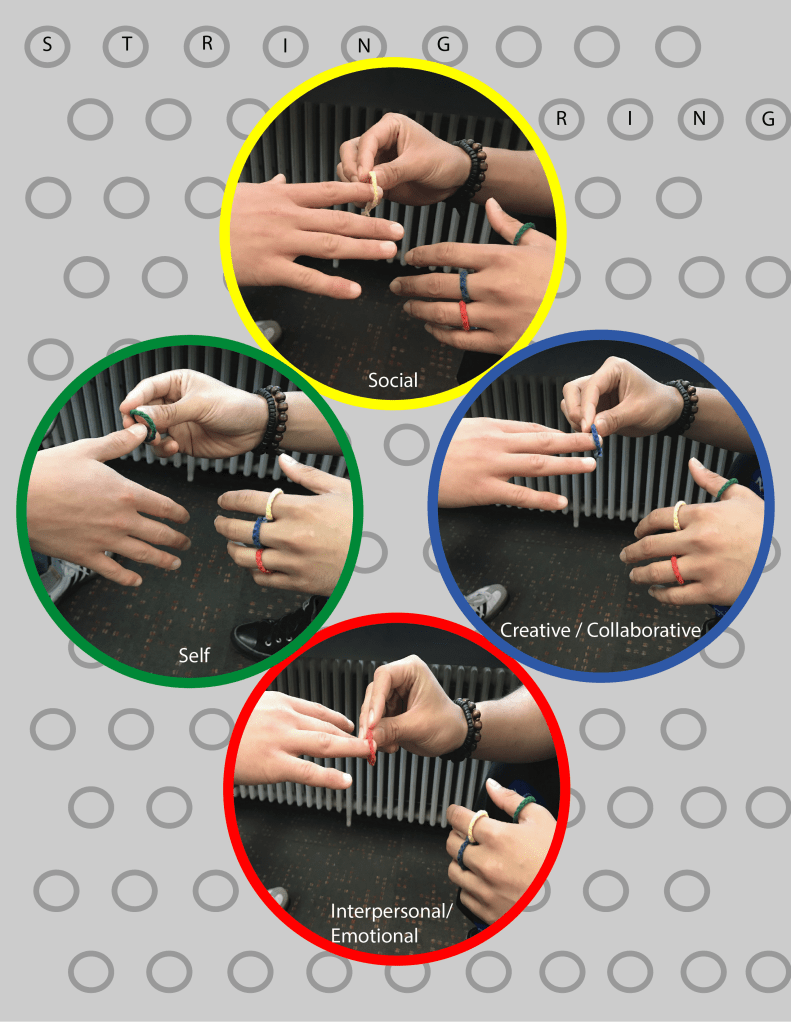 A physical, visual, and gestural system of tracking one’s different commitments. String rings are categorized into Interpersonal/Emotional, Creative/Collaborative, Social, and Self commitments (detailed in the “Ring Key.”)