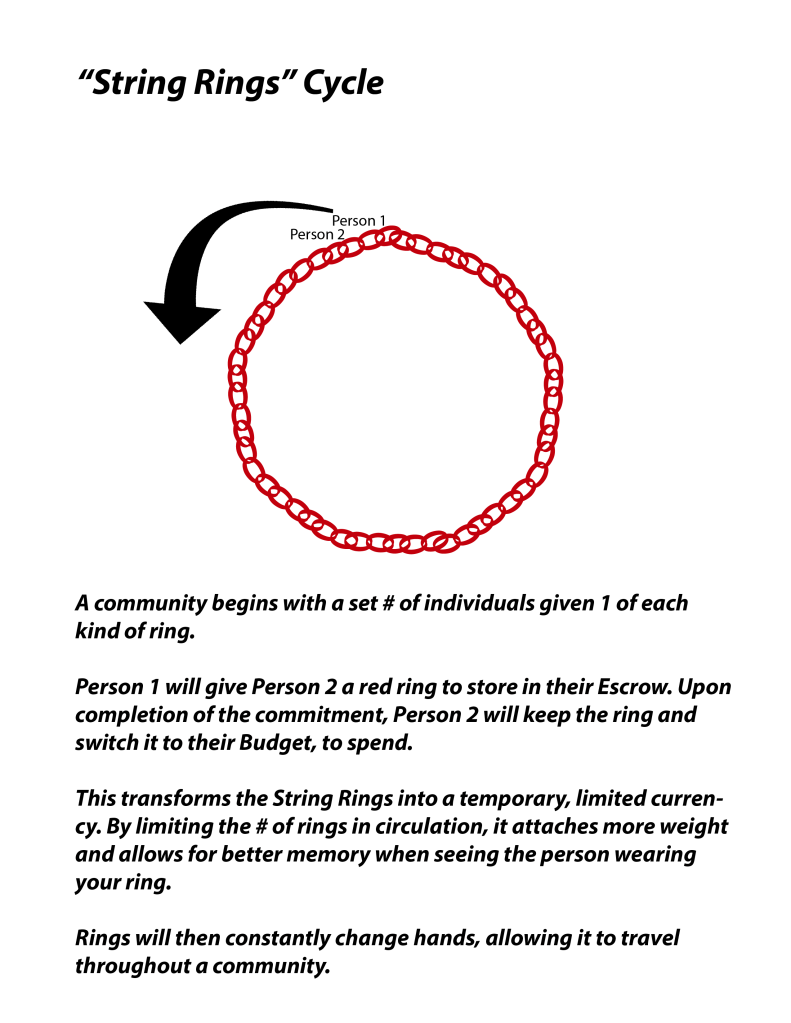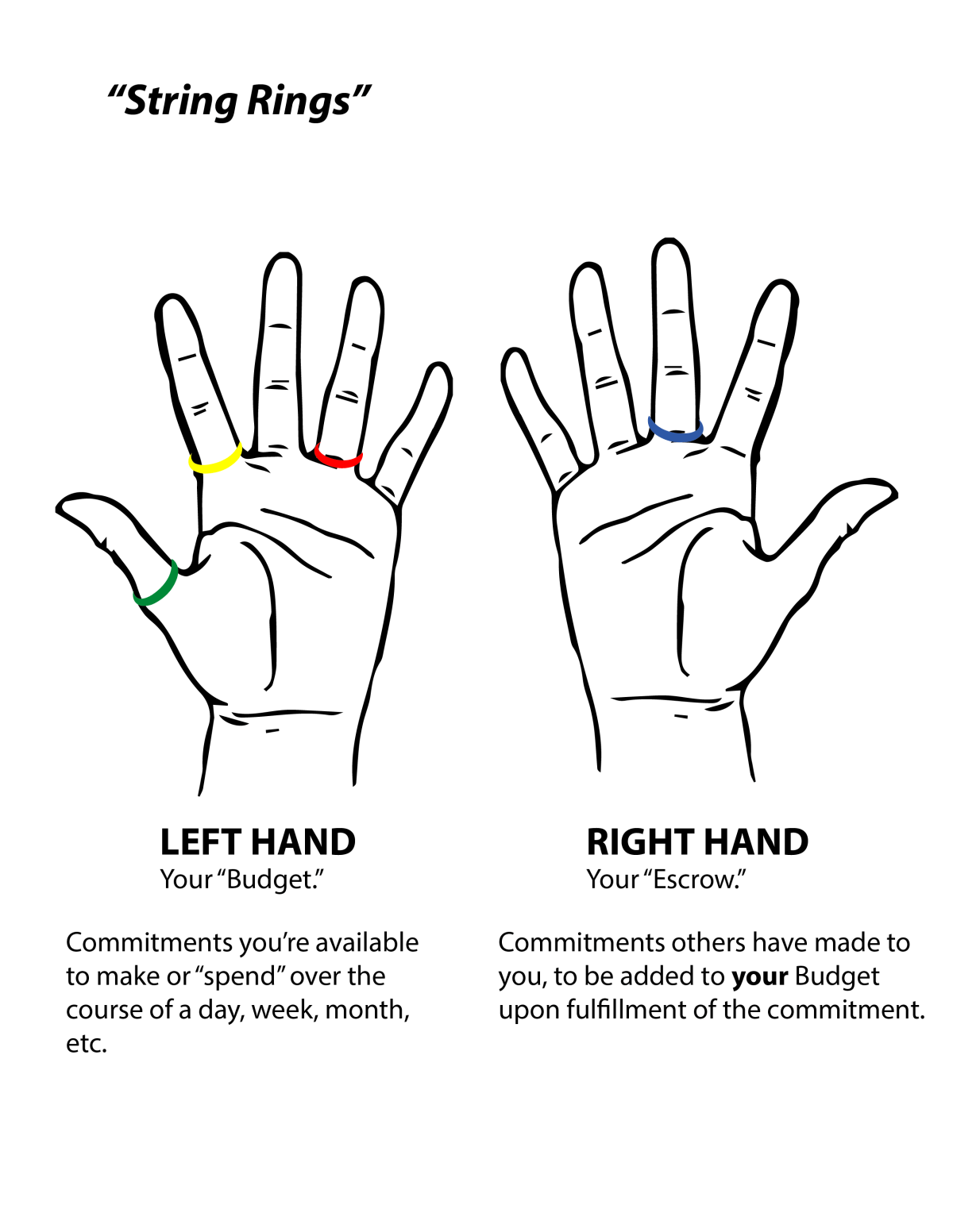 Individuals wear string rings on their Left Hand to represent their “Budget,” or rings they have available to “spend.” Individuals wear string rings on their Right Hand to represent their “Escrow,” or commitments made to them.